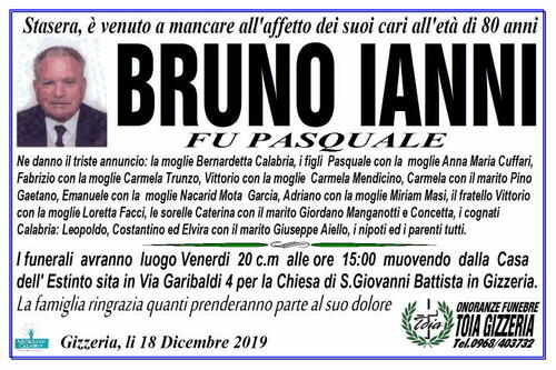 I funerali avranno luogo Venerdi 20 c.m alle ore 15:00 muovendo dalla Casa