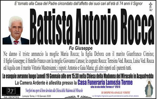 Ne danno il triste annuncio la moglie Maria Rocca; la figlia Debora con il marito Gianfranco Cimino; il figlio Giuseppe; il fratello Franco con la moglie Giovanna Caruso; le cognate Rocca: Teresina Ved. Rocca, Luisa Ved. Rocca ed Aquila con il marito Vittorio Mastroianni; i nipoti: Antonio e Gaia Maria; gli altri nipoti ed i parenti tutti.