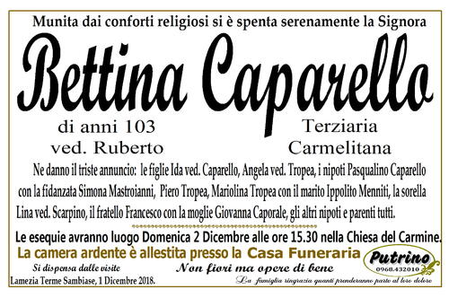 Le esequie avranno luogo Domenica 2 Dicembre alle ore 15.30 nella Chiesa del Carmine.