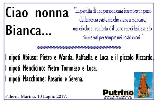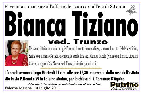 Ne danno il triste annuncio: Pina con il marito Franco Abiuso, Lina con il marito Fedele Mendicino, Sarina con il marito Battista Macchione, le sorelle Lina ved. Menniti, Isabella (Ninna) con il marito Giovanni Crocco, la cognata Rita Nicastri ved. Trunzo, i nipoti e parenti tutti.