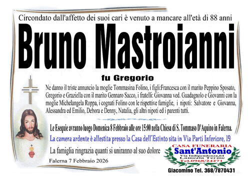 Ne danno il triste annuncio la moglie Tommasina Folino, i figli: Francesca con il marito Peppino Sposato, Gregorio e Graziella con il marito Gennaro Sacco, i fratelli: Giovanna ved. Guadagnolo e Giovanni con la moglie Michelangela Roppa, i cognati Folino con le rispettive famiglie, i nipoti: Salvatore e Giovanna, Alessandra ed Emilio, Debora e Denny, Natalia, gli altri nipoti ed i parenti tutti.