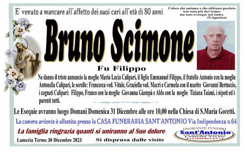 Ne danno il triste annuncio la moglie Maria Lucia Calipari, il figlio Emmanuel Filippo, il fratello Antonio con la moglie Antonella Calipari, le sorelle: Francesca ved. Vitale, Graziella ved. Macrì e Carmela con il marito Giovanni Bertuccio, i cognati Calipari: Filippo, Franco con la moglie Giovanna Giampà e Aldo con la moglie Tiziana Taiani, i nipoti ed i parenti tutti.