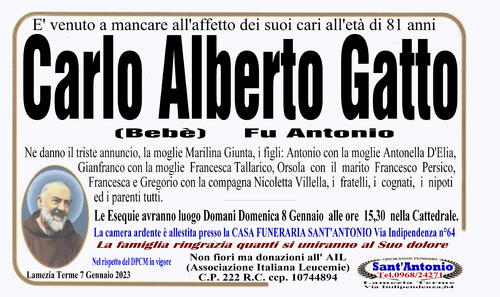 Ne danno il triste annuncio , la moglie Marilina Giunta , i figli : Antonio con la moglie Antonella D'Elia , Gianfranco con la moglie Francesca Tallarico , Orsola con il marito Francesco Persico , Francesca e Gregorio con la compagna Nicoletta Villella , i fratelli , i cognati , i nipoti ed i parenti tutti.