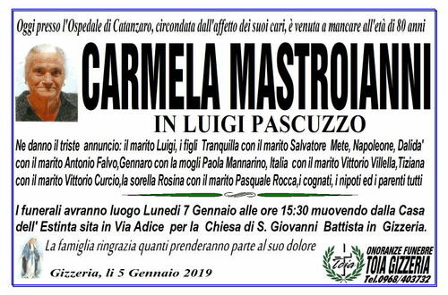 Oggi presso l'Ospedale di Catanzaro, circondata dall'affetto dei suoi cari, è venuta a mancare all'età di 80 anni