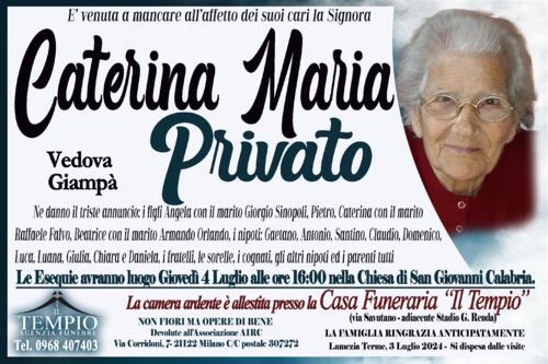 Le Esequie avranno luogo Giovedì 4 Luglio alle ore 16:00 nella Chiesa di San Giovanni Calabria.