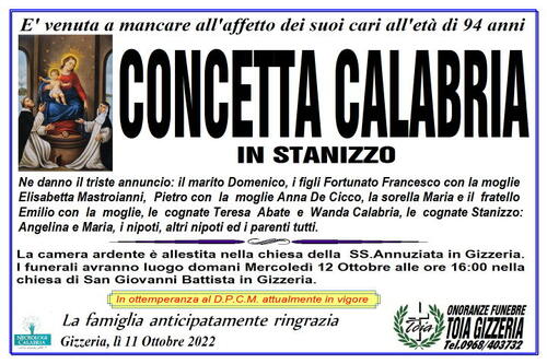 La camera ardente è allestita nella chiesa della SS.Annuziata in Gizzeria.