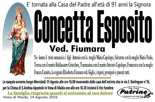 Le esequie avranno luogo Mercoledì 15 Agosto alle ore 16,00 muovendo dalla casa dell'estinta sita in via E. Berlinguer n°16, per la Chiesa di S.Andrea Apostolo in Vena di Maida ove alle ore 16.30 inizierà il rito funebre.