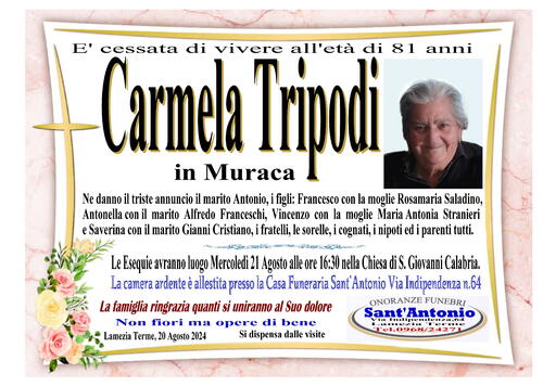 Ne danno il triste annuncio il marito Antonio, i figli: Francesco con la moglie Rosamaria Saladino, Antonella con il marito Alfredo Franceschi, Vincenzo con la moglie Maria Antonia Stranieri e Saverina con il marito Gianni Cristiano, i fratelli, le sorelle, i cognati, i nipoti ed i parenti tutti.