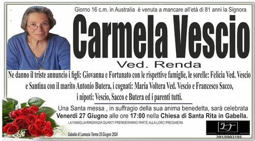Ne danno il triste annuncio i figli: Giovanna e Fortunato con le rispettive famiglie, le sorelle: Felicia Ved. Vescio