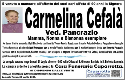 Ne danno il triste annuncio: i figli Elisabetta con il marito Tonino Renda, Rosetta con il marito Antonio De Luca, Pasquale con la moglie Teresa Paonessa, gli adorati nipoti Francesco con la moglie Valeria, Mariateresa con il marito Giuseppe, Sonia con il marito Pasquale, Giovanna con la moglie Patrizia, Karmen e Giulia, i cari pronipoti, le cognate Teresa Caparrotta ved. Cefalà, Caterina D'Elia ved. Cefalà, gli altri cari nipoti e parenti tutti.