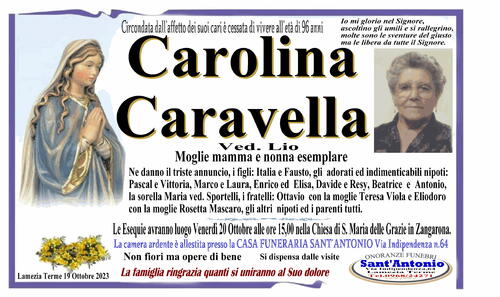 Ne danno il triste annuncio,i figli: Italia e Fausto, gli adorati ed indimenticabili nipoti: Pascal e Vittoria, Marco e Laura, Enrico ed Elisa, Davide e Resy, Beatrice e Antonio, la sorella Maria ved. Sportelli, i fratelli: Ottavio con la moglie Teresa Viola e Eliodoro con la moglie Rosetta Mascaro,gli altri nipoti ed i parenti tutti.