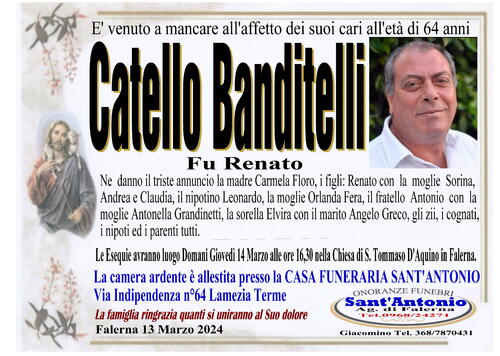 Ne danno il triste annuncio la madre Carmela Floro, i figli: Renato con la moglie Sorina, Andrea e Claudia, il nipotino Leonardo, la moglie Orlanda Fera, il fratello Antonio con la moglie Antonella Grandinetti, la sorella Elvira con il marito Angelo Greco, gli zii, i cognati, i nipoti ed i parenti tutti.