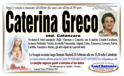 Ne danno il triste annuncio i figli Vincenzo e Concetta con il marito Cataldo Cavallaro, la nuora Stefanina Varano, la sorella Vincenzina, i nipoti: Giusy, Francesco, Lorenzo, Fulvio, Laetitia, Vincenzo e Harley, gli altri nipoti ed i parenti tutti.