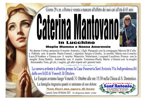 Ne danno il triste annuncio il marito Antonio, i figli: Pasquale con la compagna Marzia Di Cello e Fabiola con il marito Paolo Ferrari, i nipotini: Sergio e Giulio, le sorelle: Maria con il marito Luca D'Andrea e Teresa con il marito Maurizio Notarianni, i cognati Lucchino: Franco con la moglie Enza Dattilo, Antonella con il marito Tommaso Paola, Maria e Gianni con la moglie Alessandra Toia, gli zii, i cugini, gli altri nipoti ed i parenti tutti.