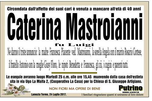 Le esequie avranno luogo Martedi 25 c.m. alle ore 15,45 muovendo dalla casa dell'estinta