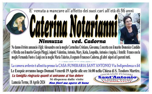 Ne danno il triste annuncio i figli: Alessandro con la moglie Carmelina Cristiano, Giovanna, Concetta con il marito Domenico Candido e Mirella con il marito Giorgio Pileggi, i nipoti: Valentina, Antonio, Mary, Katia, Leopoldo, Antonio e Angela, i fratelli: Franco con la moglie Fernanda Fusto e Luigi con la moglie Maria Talarico, il cognato Francesco Cadorna, gli altri nipoti ed i parenti tutti.