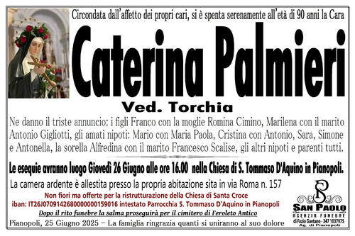 Le esequie avranno luogo Giovedì 26 Giugno alle ore 16.00 nella Chiesa di S. Tommaso D'Aquino in Pianopoli.