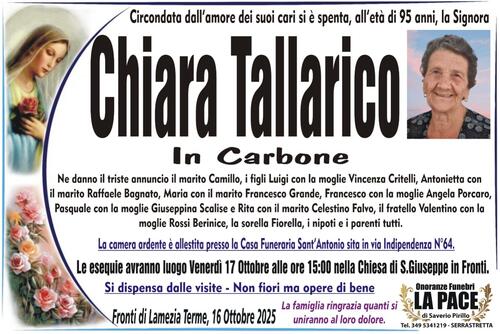 Ne danno il triste annuncio il marito Camillo, i figli Luigi con la moglie Vincenza Critelli, Antonietta con il marito Raffaele Bagnato, Maria con il marito Francesco Grande, Francesco con la moglie Angela Porcaro, Pasquale con la moglie Giuseppina Scalise e Rita con il marito Celestino Falvo, il fratello Valentino con la moglie Rossi Berinice, la sorella Fiorella,i nipoti e i parenti tutti.