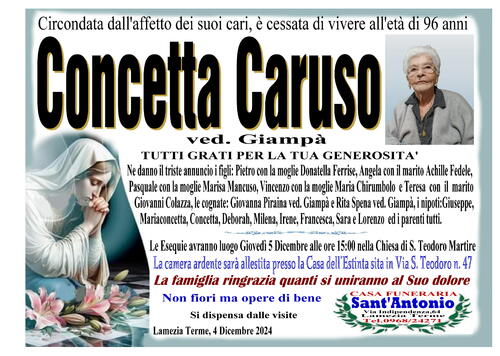 Ne danno il triste annuncio i figli: Pietro con la moglie Donatella Ferrise, Angela con il marito Achille Fedele, Pasquale con la moglie Marisa Mancuso, Vincenzo con la moglie Maria Chirumbolo e Teresa con il marito Giovanni Colazza, le cognate: Giovanna Piraina ved. Giampà e Rita Spena ved. Giampà, i nipoti: Giuseppe, Mariaconcetta, Concetta, Deborah, Milena, Irene, Francesca, Sara e Lorenzo ed i parenti tutti.