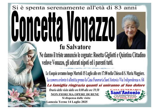 Ne danno il triste annuncio le cognate: Rosetta Gigliotti e Quintina Cittadino vedove Vonazzo, gli adorati nipoti ed i parenti tutti.