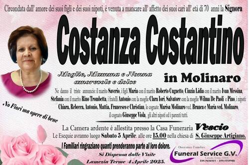 Ne danno il triste annuncio: il marito Saverio, i figli Maria con il marito Roberto Cugnetto, Cinzia Lidia con il marito Ivan Messina,