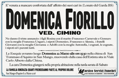Le Esequie avranno luogo Domenica 22 Marzo alle ore 15:30 nella chiesa di San Tommaso d'Aquino in San Mango, muovendo dalla casa dell'Estinta sita in Viale