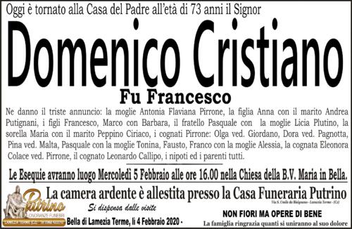 “Solo oggi e per puro caso mi sono imbattuto in questo necrologio. Non averlo saputo in tempi adeguati, mi rattrista e mi sconvolge aver saputo della perdita di mio cugino Domenico. Io Pino Pellegrino figlio di fu Carlo fratello di Antonietta, mamma di Domenico, Pasquale e Maria, cugini che stimo moltissimo. Ormai lontani geograficamente ma non nei pensieri. Il mio triste saluto: Riposa In Pace mio caro cugino Domenico. Un caro saluto a tutti i soi familiari. ”