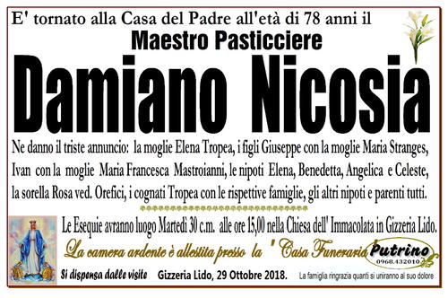 Le Esequie avranno luogo Martedì 30 c.m. alle ore 15,00 nella Chiesa dell' Immacolata in Gizzeria Lido.