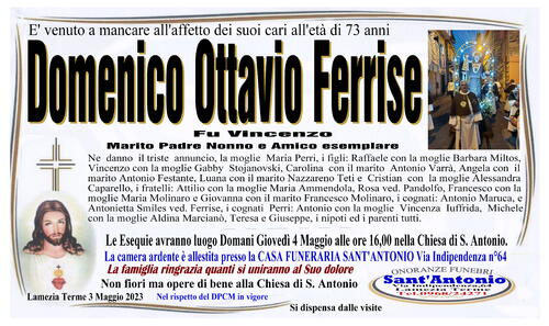 Ne danno il triste annuncio, la moglie Maria Perri, i figli: Raffaele con la moglie Barbara Miltos, Vincenzo con la moglie Gabby Stojanovski, Carolina con il marito Antonio Varrà, Angela con il marito Antonio Festante, Luana con il marito Nazzareno Teti e Cristian con la moglie Alessandra Caparello, i fratelli: Attilio con la moglie Maria Ammendola, Rosa ved. Pandolfo, Francesco con la moglie Maria Molinaro e Giovanna con il marito Francesco Molinaro, i cognati: Antonio Maruca e Antonietta Smiles ved. Ferrise, i cognati Perri: Antonio con la moglie Vincenza Iuffrida, Michele con la moglie Aldina Marcianò, Teresa e Giuseppe, i nipoti ed i parenti tutti.