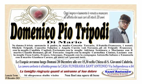 Ne danno il triste annuncio il padre, la madre Concetta Torcasio, il fratello Francesco, i nonni: Michele Tripodi, Concetta Talarico e Angela Curcio ved. Torcasio, gli zii Tripodi: Francesco con la moglie Candida Caglioti, Fortunato con la moglie Adriana Seminara e Marianna con il marito Claudio Romano, gli zii Torcasio: Angelo con la moglie Carmelina Cimino, Luciano con la moglie Enza Gatto, Franco, Giuseppe, Pasquale con la compagna Antonella Iuliano ed Emanuela con il marito Gianluca Caruso, gli amici ed i parenti tutti.