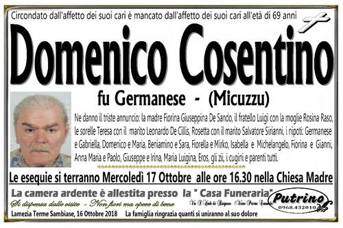 Lamezia Terme Sambiase, 16 Ottobre 2018 La famiglia ringrazia quanti si uniranno al suo dolore