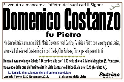 I funerali avranno luogo Sabato 1 Dicembre alle ore 11.30 nella chiesa S. Maria Maggiore (S. Francesco),