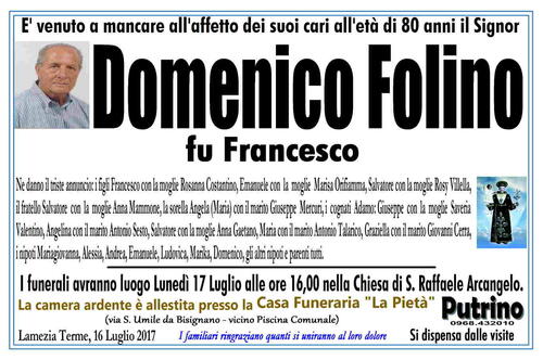 I funerali avranno luogo Lunedì 17 Luglio alle ore 16,00 nella Chiesa di S. Raffaele Arcangelo.