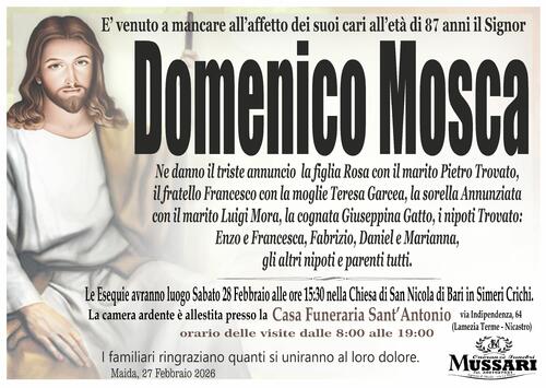 Ne danno il triste annuncio la figlia Rosa con il marito Pietro Trovato, il fratello Francesco con la moglie Teresa Garcea, la sorella Annunziata con il marito Luigi Mora la cognata Giuseppina Gatto, i nipoti Trovato: Enzo e Francesca, Fabrizio, Daniel e Marianna, gli altri nipoti e parenti tutti.