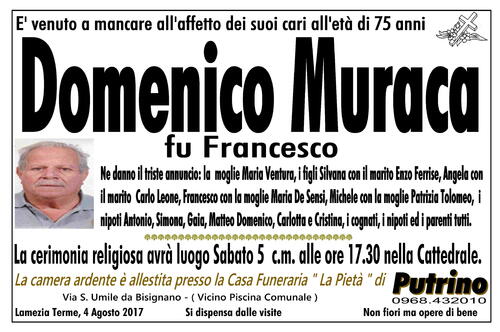 Lamezia Terme, 4 Agosto 2017 Si dispensa dalle visite Non fiori ma opere di bene