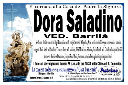 I funerali si svolgeranno Lunedì 28 c.m. alle ore 15.30 nella Chiesa di S. Domenico.