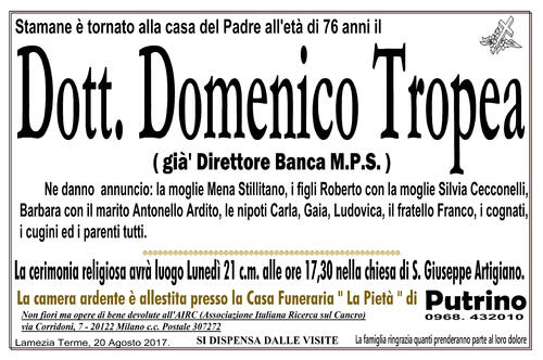 Ne danno annuncio: la moglie Mena Stillitano, i figli Roberto con la moglie Silvia Cecconelli, Barbara con il marito Antonello Ardito, le nipoti Carla, Gaia, Ludovica, il fratello Franco, i cognati, i cugini ed i parenti tutti.