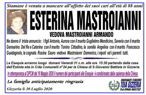 Le Esequie avranno luogo domani Venerdì 31 c.m. alle ore 15:30 partendo dalla casa