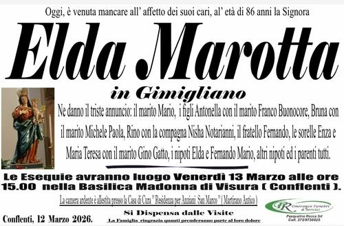 Oggi è venuta a mancare all'affetto dei suoi cari, all'età di 86 anni, la Signora Elda Marotta