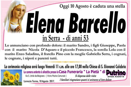 La camera ardente è allestita presso la Casa Funeraria '' La Pietà '' di Putrino 0968.432010