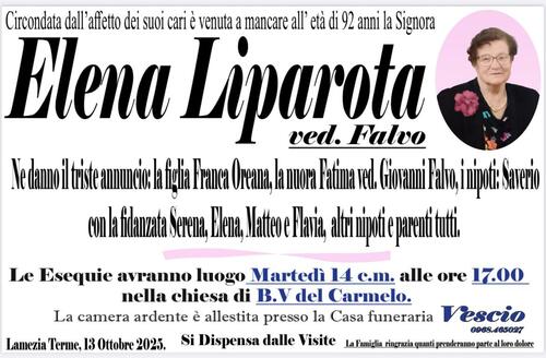 Ne danno il triste annuncio: la figlia Franca Oreana, la nuora Fatima ved. Giovanni Falvo, i nipoti: Saverio