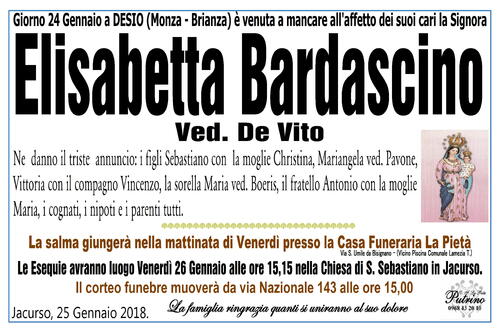 Giorno 24 Gennaio a DESIO (Monza - Brianza) è venuta a mancare all'affetto dei suoi cari la Signora