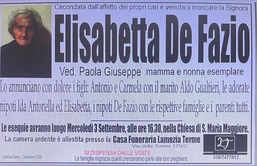 Le esequie avranno luogo Mercoledì 3 Settembre, alle ore 16.30, nella Chiesa di S. Maria Maggiore.