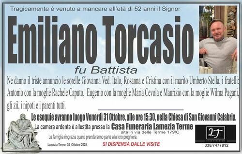Le esequie avranno luogo Venerdì 31 Ottobre, alle ore 15:30, nella Chiesa di San Giovanni Calabria.