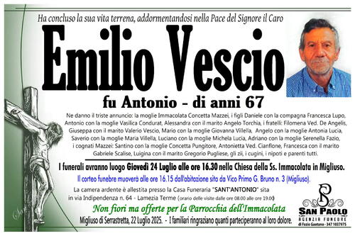 I funerali avranno luogo Giovedì 24 Luglio alle ore 16.30 nella Chiesa della Ss. Immacolata in Migliuso.