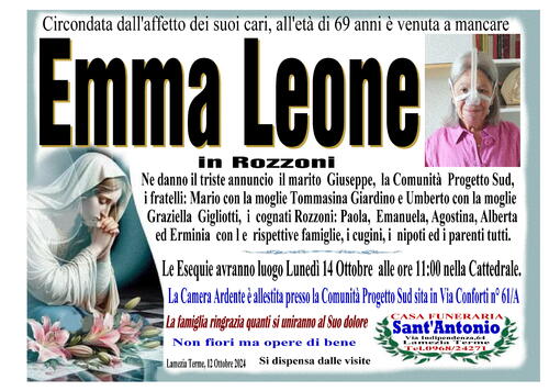 Ne danno il triste annuncio il marito Giuseppe, la Comunità Progetto Sud, i fratelli: Mario con la moglie Tommasina Giardino e Umberto con la moglie Graziella Gigliotti, i cognati Rozzoni: Paola, Emanuela, Agostina, Alberta ed Erminia con le rispettive famiglie, i cugini, i nipoti ed i parenti tutti.