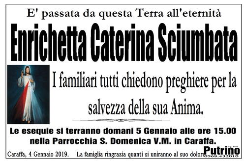 Caraffa, 4 Gennaio 2019. La famiglia ringrazia quanti si uniranno al suo dolore 0.F PUTRINO