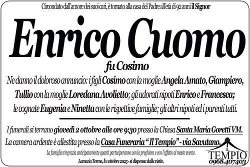 La camera ardente è allestita presso la Casa Funeraria “ Il Tempio” - via Savutano.