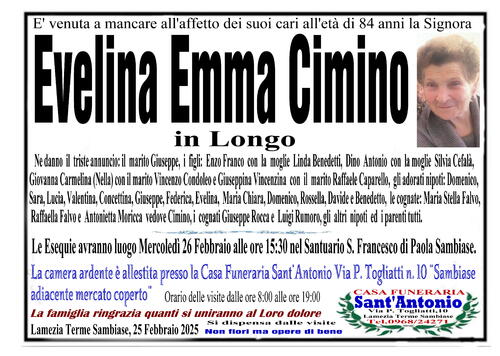 Ne danno il triste annuncio il marito Giuseppe, i figli: Enzo Franco con la moglie Linda Benedetti, Dino Antonio con la moglie Silvia Cefalà, Giovanna Carmelina (Nella) con il marito Vincenzo Condoleo e Giuseppina Vincenzina con il marito Raffaele Caparello, gli adorati nipoti: Domenico, Sara, Lucia, Valentina, Concettina, Giuseppe, Federica, Evelina, Maria Chiara, Domenico, Rossella, Davide e Benedetto, le cognate: Maria Stella Falvo, Raffaella Falvo e Antonietta Moricca vedove Cimino, i cognati: Giuseppe Rocca e Luigi Rumoro, gli altri nipoti ed i parenti tutti.