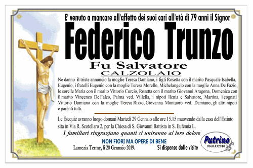Le Esequie avranno luogo domani Martedì 29 Gennaio alle ore 15.15 muovendo dalla casa dell'Estinto